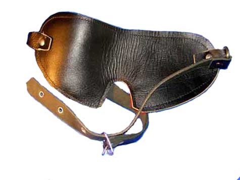 Sewn edges and eyeleted fastening strap at the back of the mask.
