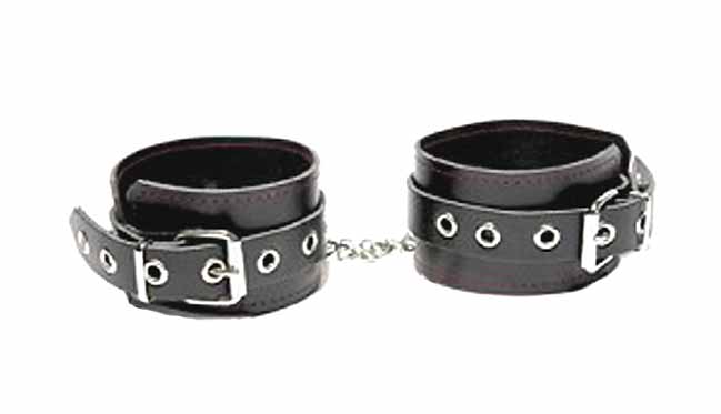 These cuffs can be locked at the buckle by passing a small padlock through the strap eyelet and then through the buckle body.