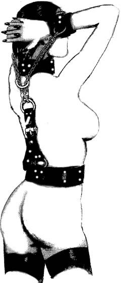 Neck collar, waist belt, wrist cuffs and adjustable chain set that goes through a large D-ring riveted to the collar.