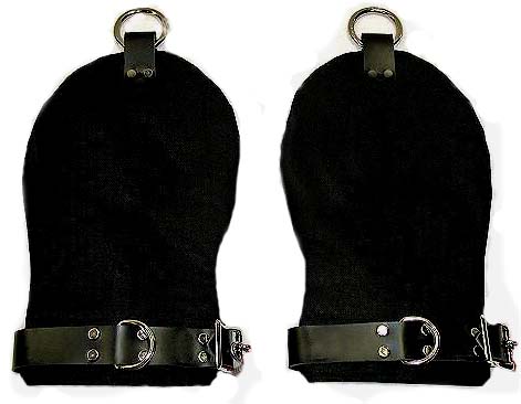 Leather and canvas bondage restriction chastity gloves.
