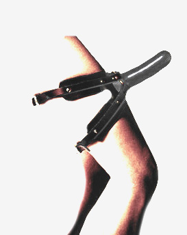 A rubber dildo is firmly mounted on a stout leather harness that fits neatly onto your thigh.